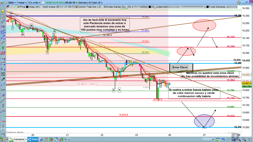 Desde donde ha empezado la apertura semanal, por la parte superior tenemos diferentes zonas de resistencia que pueden llegar a ser muy importantes más un día como hoy que es lunes y estadísticamente no suelen dar grandes recorridos. En la zona de los, 15920, tenemos una directriz importante de medio plazo. Unos puntos más abajo, justo en el momento de preapertura, en la zona de los,15890, pasa la directriz que ha canalizado toda la bajada de la semana anterior. Si el precio pudiera romper estas dos directrices por la parte superior relativamente cerca, todavía queda la cota histórica importante de los,15980, que ha tenido amplio protagonismo estas últimas semanas y qué o hay mucha fuerza o difícilmente la va a quebrar.
