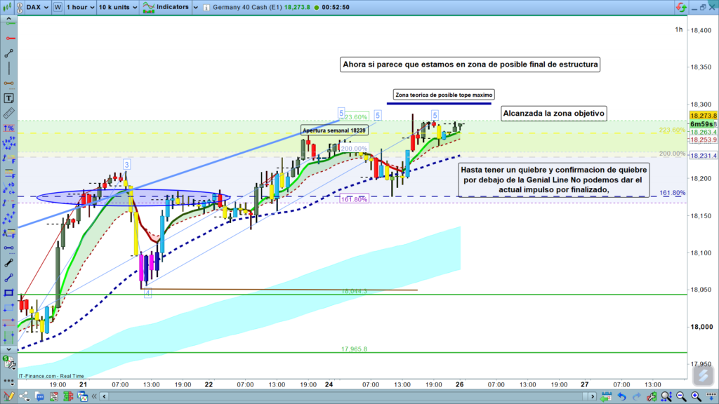 En gráfico de una hora del Dax 40, vemos como por fin hemos llegado a la zona marcada como objetivo, ahora falta ver exactamente dónde finaliza esta estructura, el actual movimiento parece que podría tener un tope en la zona de los 18301, sin embargo, dados los últimos impulso corrección y regulares que ha efectuado el precio podría quedar una nueva mini estructura.