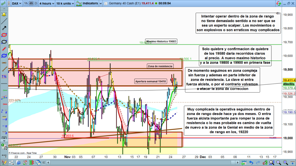 Día completamente neutro el de ayer, apertura semanal en la zona de los, 19418, para acabar cerrando el día en la zona de los, 19392. Como podéis ver, aparte del hueco en la apertura semanal, 60 puntos más arriba del cierre de la pasada semana, el precio durante todo el día se ha estado moviendo en una estrecha franja en la parte inferior de la zona de corrección. Pequeño rango y movimiento sin fuerza en una zona de apenas 40 puntos, lunes inoperable con movimientos completamente erráticos y sin apenas recorrido.