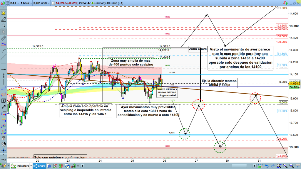 En principio, lo más lógico seria consolidación en la cota histórica de los 14100, si consigue superarla y tener un apoyo claro sobre los 14100, posible rally hasta los 14200 a 14228, y posible nueva bajada hasta los 14100, o de nuevo fin del día en la zona de los 14050.
