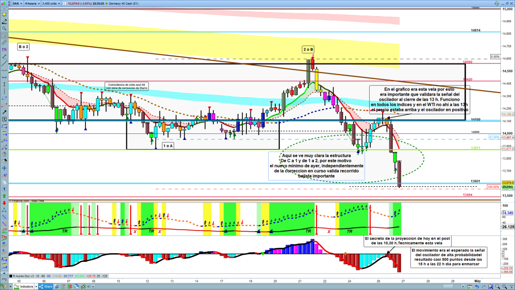 En el post de las 10,30 h, donde cada día intento discernir, que instrumentos son operables y cuáles no, por si están con fuerza y en recorridos claros o están consolidando de forma errática. Hoy en las cuatro líneas del dax escribía lo siguiente. «Dax, De momento, escenario previsto, testeo a la zona, cinta azul y rebote. El oscilador Genial Aldo, en H4, de manera provisional marca escenario bajista, hay que esperar al cierre de la vela a las 13 h. Parece giro en línea 0 y nueva vela bajista, solo falta entrada de fuerza para evolución clara y noble, además barra roja de final de movimiento alcista en H1, objetivo previsto 13601. Cierre de velas debajo de 14000, quiebre de Genial de H1, serian la validación, y posiblemente a partir de ahí entraría fuerza. Al tener la señal en H4, en caso de que se confirme a las 13 h, veremos si la fuerza entra esta mañana o más tarde.» exactamente lo que sucedió. Trade de 455 puntos desde unos minutos antes de las 15 h hasta las 22 h, como diría Marc, era tan claro que hasta se podía plantear un «all in».