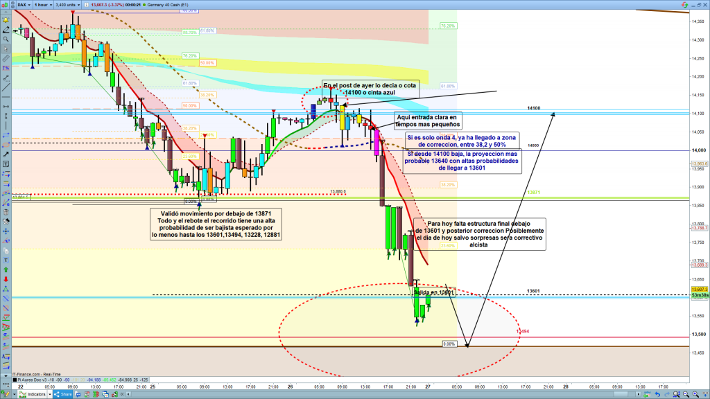 Creo que en sesión asiática, el precio llegara hasta la zona de soporte de gráficos grandes, 13494, posiblemente un poco más abajo, falta una última onda, la 5 del movimiento de ayer por la tarde. y podría entrar en la zona de soporte si se mantiene la fuerza. Veremos que ocurre en sesión asiática, ahora a las 00 h, está en la zona debajo de 13601 y consolidando en corrección menor, pero lo normal sería acabar la estructura, si no en asiática, en preapertura. Pienso que lo lógico seria que hoy, acabada la estructura de ayer, fuera un día correctivo, alcista, esperando validaciones claras de cambio de tendencia, antes de entrar alcistas.