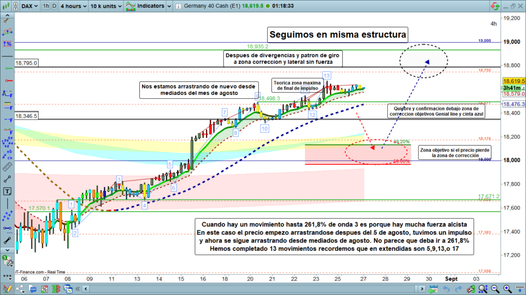 A nivel técnico, solo reseñar que para tener un movimiento de onda 3, hasta la zona de los, 261,8%, normalmente solo se produce en movimientos de mucha fuerza de demanda o fuerza alcista. Obviamente, este no es el caso, el precio salvo el pequeño impulso que realizó entre los días 15 y 19 de agosto, lleva prácticamente todo el mes arrastrándose por encima de la zona de corrección. Por otro lado, bien a nivel técnico, parece que el precio ha realizado 13 movimientos en total, teniendo en cuenta que estamos en renta variable europea y que en las ondas tres extendidas, cuando hay una doble extendida, la cantidad de movimientos de la onda 3, son 13. la serie de movimientos de una estructura con onda extendida, son 5,9,13,17, 21….