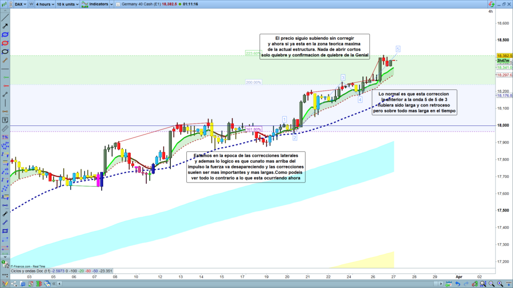 Análisis diario Dax, tipo flash corto, lectura de 2 a 4 minutos, con las claves del día. Ondas de Elliot, estructuras de precio, zonas clave y objetivos.