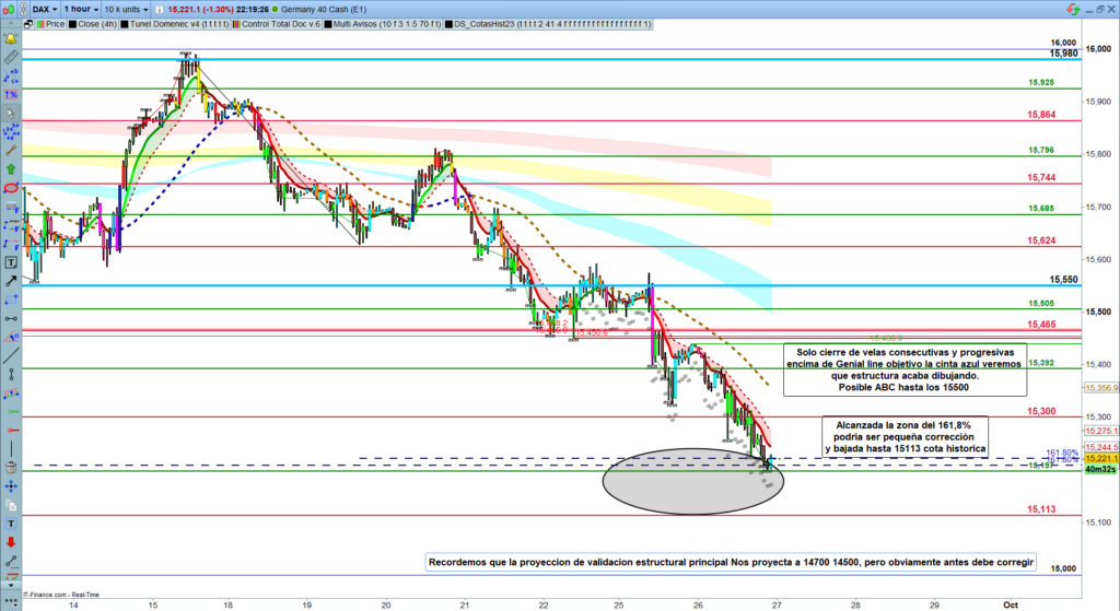 En gráfico de una hora del Dax 40, la estructura dejada después del cierre de Wall Street, no parece que sea una estructura finalizada. Por tanto, es probable que tengamos una corrección no demasiado importante, y quizás un último impulso. Si esto ocurre, solo con un mínimo por debajo de los,15200, tendríamos entrada de validación hasta la cota histórica diaria de los, 15113.