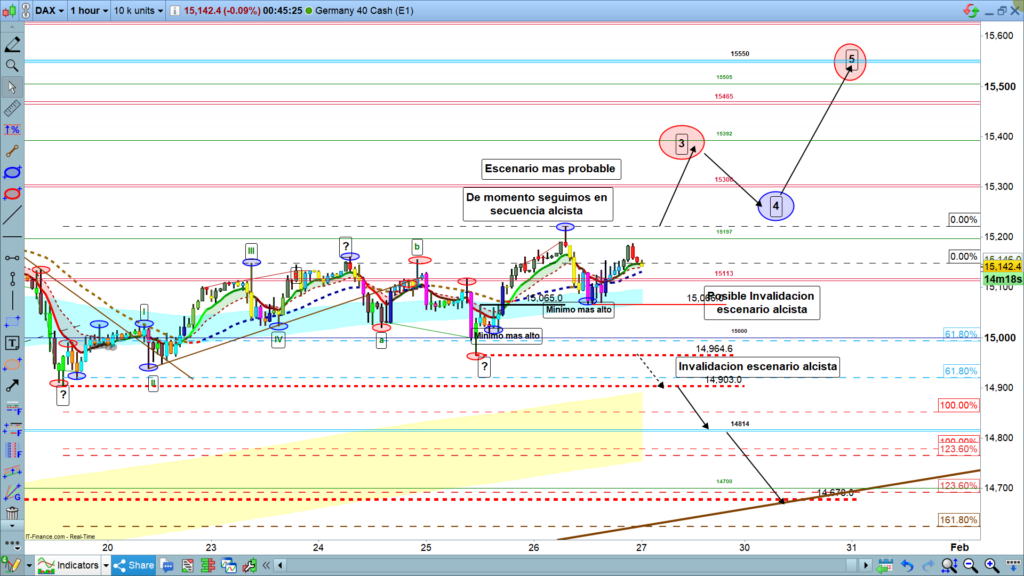 La continuación y confirmación de la secuencia alcista, la tendríamos con un nuevo alto, aunque sea por un solo punto por encima de los 15221, el objetivo inicial, la cota histórica del 15300, y posterior movimiento por la parte superior. Posiblemente, hasta la zona de la cota de corto plazo en los 15392, posiblemente en esta zona o entre esta zona y la cota histórica diaria siguiente en los 15465, debería ser final de onda 3, corrección y nuevo impulso hasta la zona de los 15465 y 15550.