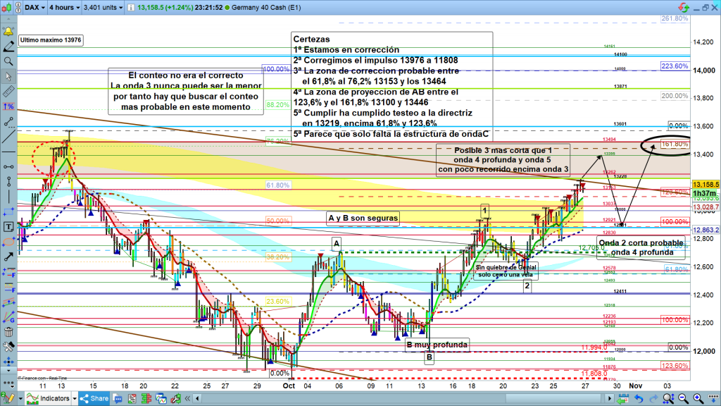 - 3.- La zona de corrección más probable de este impulso, es la zona entre los 61,8% y los, 76,2%, o sea entre los 13153, (ya sobrepasado), y los 13464.
