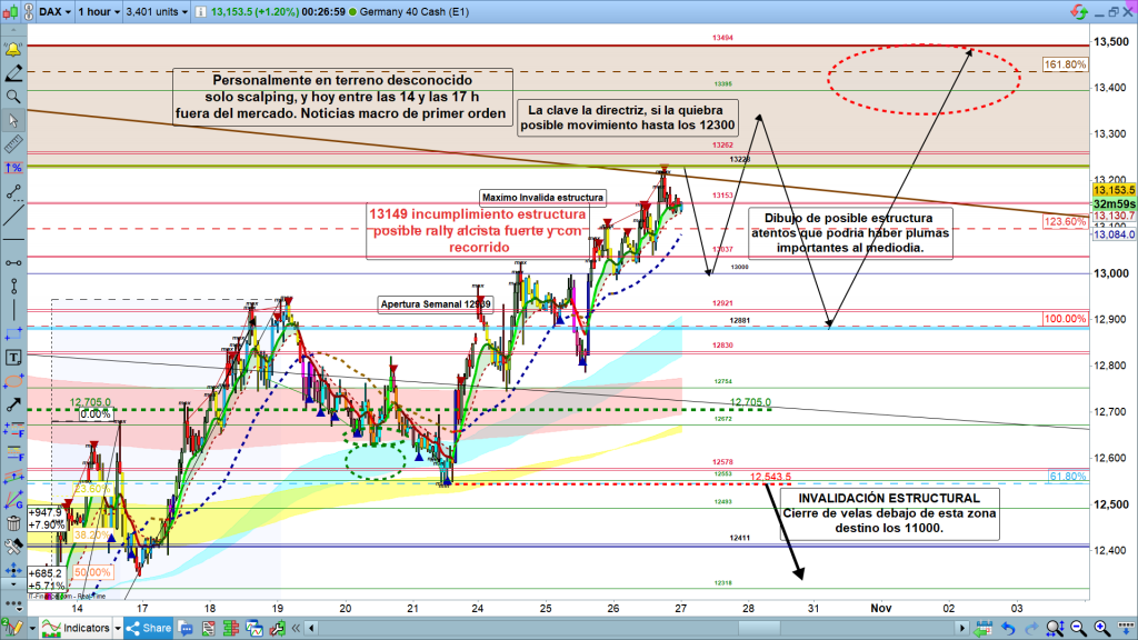 Después de la preapertura y la apertura que marquen camino, para la operativa durante la mañana, se acabó el día. A las 14 h, bueno, a las 14,15 h, empieza la fiesta de datos macro. tasas de interés, zona euro, y 15 minutos después Producto Interior Bruto de Usa, con un consenso con crecimiento del PIB, espectacular. Tanto si se cumple como si no se cumple será sorpresa para muchos. En este tipo de situaciones lo mejor es estar fuera del mercado. Después, a partir del cierre de Frankfurt, a las 17,34 h, podríamos tener unos recorridos claros e interesantes, en el sentido o dirección, que ya debería haber marcado el mercado. Muchísima suerte y muy buenos trades.