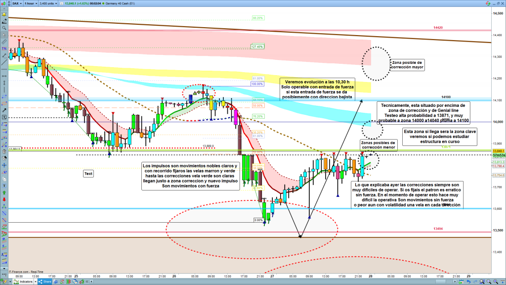 Si en los 13871, se da la vuelta, deberíamos esperar a que perdiera los 13601, antes de tener una entrada clara, a no ser que viéramos entrada de fuerza. Velas marrones oscuro, o los que operéis con las velas verdes y rojas, patrón, de continuidad en bajada de las velas, que estas sean amplias sin apenas plumas y que las correcciones casi ni toquen la zona de corrección. Si miráis el patrón del pasado martes, la posible entrada de fuerza en bajada, debería dibujar un patrón muy similar al del pasado martes por la tarde. Muchísima suerte y muy buenos trades.