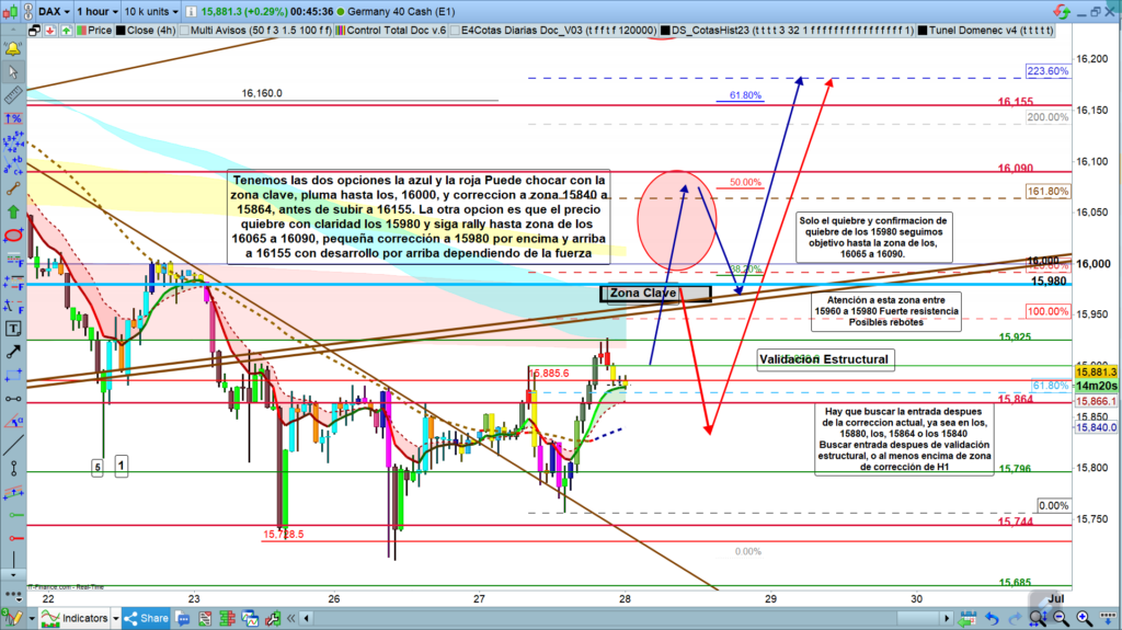 Si el precio, en cambio, tiene fuerza en alguno de los ataques a la zona de resistencia 15960 a 15980. y consigue quebrar y confirmar la zona de los 15980, entonces el objetivo será la zona de los 16065 a 16090, posible corrección, bajando de nuevo hasta los 15980, y pluma por abajo y desde allí directo a zona 16155.