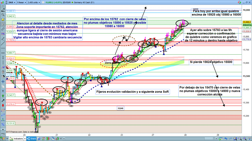 Si en el día de hoy el precio no pudiera con la zona SoR 15890 a 15925, ya alcanzada, entonces atención a la cota histórica de 15864, en primera instancia. Si la supera a la baja, la zona muy importante será la zona que nos empujó en el día de ayer la zona 15730 a 15760. Si la pierde entonces operaremos bajista con el mismo sistema, perdida con validación y/o confirmación de los 15730, objetivo 15624, si este fuera el camino dependiendo de hora en la que llegara ahí, y la fuerza en curso, atención a objetivo 15500. Si recordáis esta si es una zona muy importante validada por gráficos grandes y muy importante desde el pasado mes de abril.