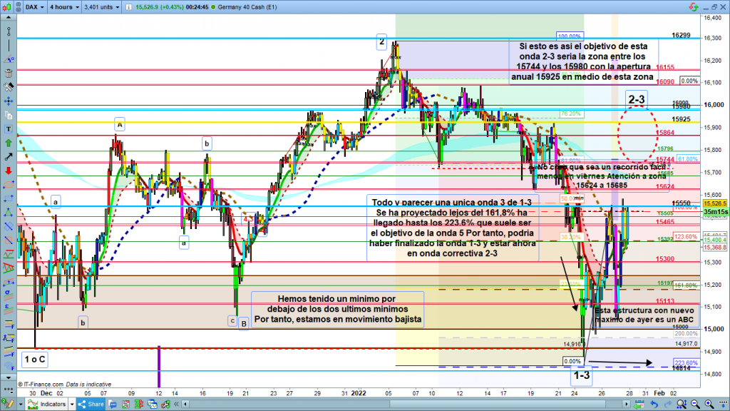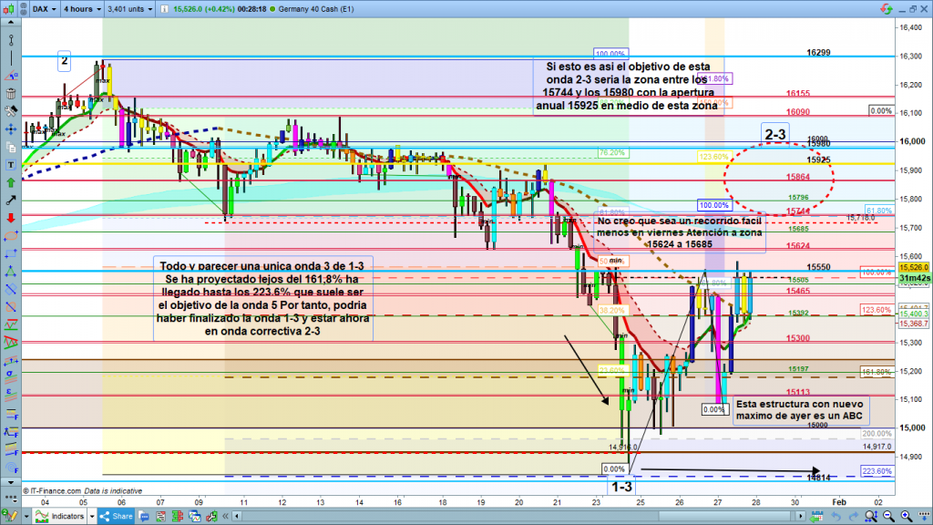 En estos momentos con los movimientos de ayer parece que lo más probable, que dada la altísima fuerza del movimiento del pasado lunes, que acabo en la zona de los 14839, no fue final de 3 de 1-3. Si no final de onda 1-3, con lo cual ahora estaríamos en corrección de onda 2-3, con objetivo en la zona entre los 15744 y los 15980 con la apertura anual en 15925, en medio de esta zona objetivo. Si esta posibilidad que ahora es la más probable es la correcta, salvo posibles correcciones hoy estaríamos en un movimiento alcista hasta la zona objetivo explicada o un poco más abajo, cuidado con las correcciones, o se pasan o se quedan cortas.
