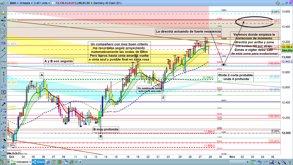 En gráfico de H1 del dax40, vemos mucho más claro el timing de ayer. Durante la mañana, bajada hasta la zona de los 13050 en corrección, con los datos de Zona Euro primero y posteriormente del PIB de Usa, rally alcista hasta los 13262, intentando hasta en dos ocasiones el quiebre de la directriz, sin conseguirlo. Al no poder, quebrar por arriba, de nuevo hacia abajo, primero hasta cota histórica 13153, la perdió y hasta la zona de los 13037, otra cota, solo pluma y está intentando el quiebre de la Genial line de H1. esta zona coincide con zona de corrección de H4.