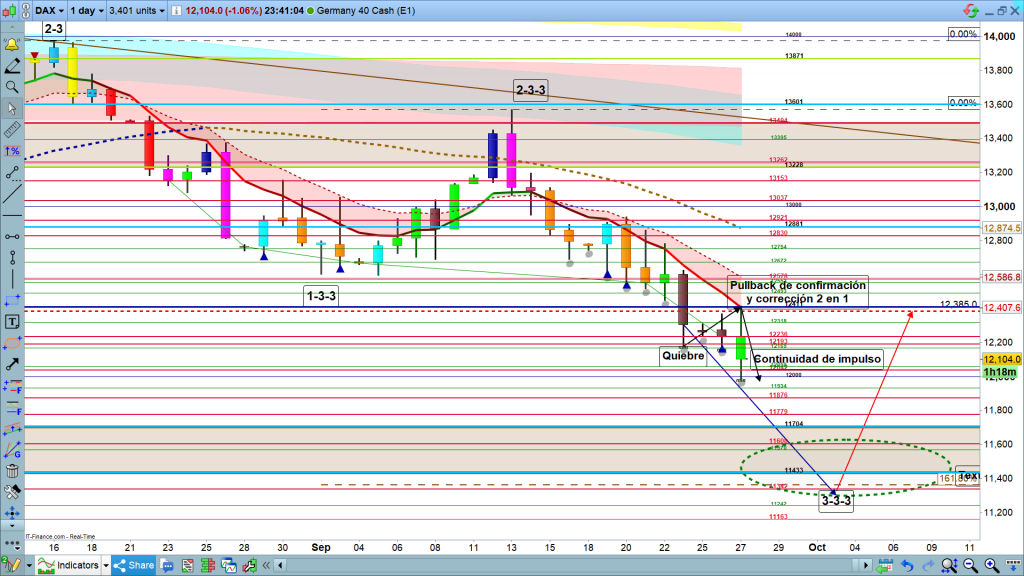 Ayer, día perfecto, según lo planteado, la clave de que no llegara hasta la cinta azul de H1, lo podéis ver vosotros mismos en el gráfico inferior de diario. Justo en el momento que la zona de corrección de diario, llegaba hasta la cota histórica muy importante del 12411, fue cuando se produjo el testeo en pullback, para confirmación de quiebre de esta cota tan importante y de nuevo tal como proyectaba en el Flash de ayer, reinicio del impulso bajista. Viendo la claridad del pullback diferentes entradas, desde las zonas 12312 y en, 12282, y para los más prudentes, la entrada en la zona marcada como validación muy clara en los 12163, la salida para todos igual, primer take profit en 12042, y segundo y cierre del trade en 12000. Operativa de libro fácil, clara y muy rentable.