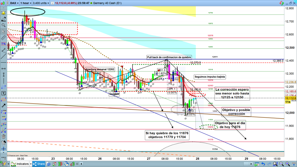 Para hoy, pequeña corrección pienso que menor, solo hasta zona de corrección de gráfico de 1 hora, posiblemente en la zona 12125 a 12150 y de nuevo continuación del movimiento bajista. Primer soporte importante y objetivo del día en cuanto a trade bajista los, 11876. Es muy posible que después de alcanzar los 11876, quizás con pluma por debajo, tengamos una corrección, esta sería hasta la zona de la Genial line de gráfico de 1 hora o la zona de las dos cotas históricas gemelas, 12236 a 12193. Finalizada la corrección, nuevo impulso bajista, soportes, cotas históricas de nuevo 11876, 11779 y sobre todo la zona de los 11704.