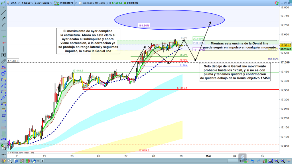 Solo si el precio pierde la zona de la genial line, al menos si la ataca con fuerza, en una pluma que llegara hasta la zona de los, 17520, si en este ataque no es solo una pluma sino que tenemos quiebre de la genial line, más concretamente quiebre y confirmación de quiebre cuidado porque el siguiente objetivo sería la zona de la cinta azul, en los, 17450.