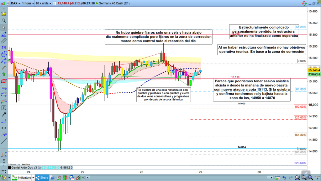 Ayer teníamos dos opciones, decíamos que si teníamos quiebre de la cinta azul de H4, en la zona de los 15200, podríamos tener movimiento hasta los 15300. sin embargo, el gráfico en H1 es muy claro, solo una vela intento quiebre, la de las 8 h, que parecía que quebraba, y la vela de las 9 h, hizo pluma por arriba, pero fijaros que cerro ya en la zona de los 15185, debajo de nuevo de los 15200, y desde allí rally bajista de casi todo el día, hasta la cota de los, 15113, consolidación y ya a última hora rebote hacia arriba, pero parece que sin fuerza.