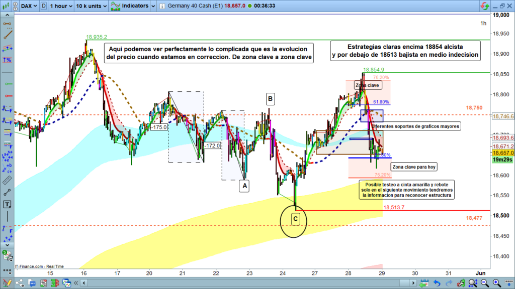 En gráfico de una hora del Dax 40, podemos ver como ayer el precio, después de girar en la zona clave dibujada, se estuvo paseando entre las diferentes zonas de soporte que ya habíamos marcado.