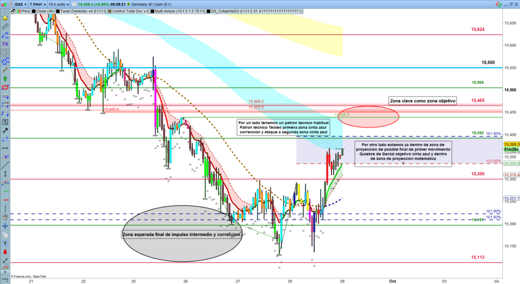 En gráfico de una hora del DAX40, De momento, tenemos una clara estructura de validación estructural y el precio ha llegado ya hasta la zona proyectada. Por otro lado, el quiebre de la zona de genial line de gráfico de una hora nos impulsaba como objetivo a la zona de la cinta azul, la parte inferior también ha sido claramente alcanzada. A partir de aquí se abren diferentes posibles voy a intentar enumerarlos para mantener en todo momento el máximo control de los movimientos del precio.