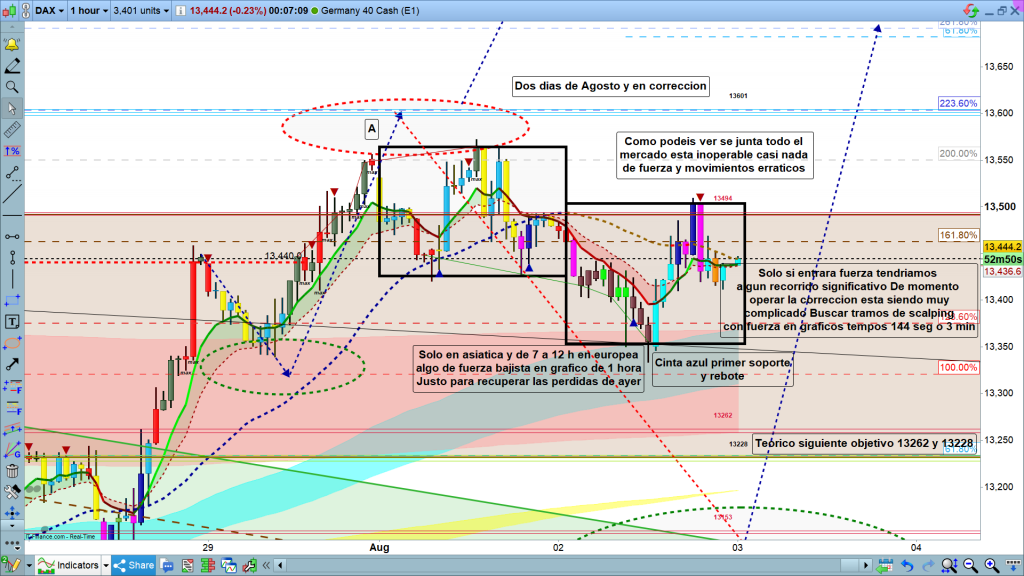 Estamos en una corrección, siempre complicadísimas de operar y muy difíciles de sacar algo de rentabilidad. Además, es agosto, y de momento estos primeros días están siendo sin evolución, comportamiento muy errático, solo tenéis que mirar el gráfico, en los rectángulos uno es del lunes y el otro de ayer martes.