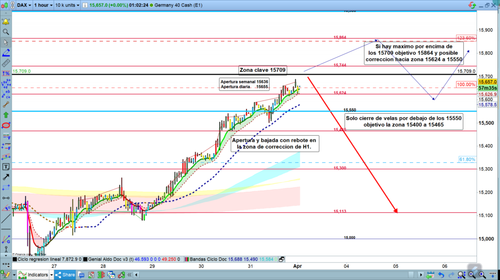 En el gráfico de 1 hora del Dax40, apertura semanal en 15636, hueco de 40 puntos con el cierre del viernes, no cubierto en los últimos minutos de sesión de Oriente, bajada hasta la zona de la cota histórica del 15624, y rebote en los primeros minutos de operativa semanal. A la 1 h el precio estaba en la zona de los, 15655. O sea, de momento, ninguna información relevante, sobre el camino que tomara el precio.