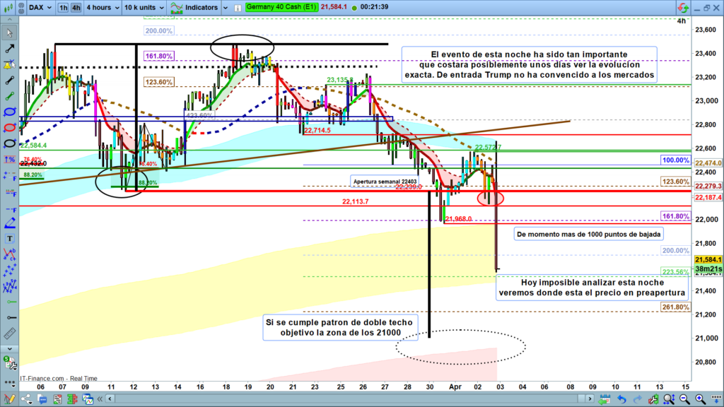 Ayer inicio del día en la zona de los, 22251, y día completamente neutro a las 21 h el precio estaba en los 22312, todo el día esperando el evento de Trump con sus aranceles. El mercado inicialmente se lo ha tomado muy mal la vela de las 21 h, a las 00,15 h, a falta todavía de 45 minutos para el cierre, ya es de más de 1000 puntos bajistas, parte superior de la vela en los, 22662, y de momento ya va por los 21 622, 1040 puntos de momento.