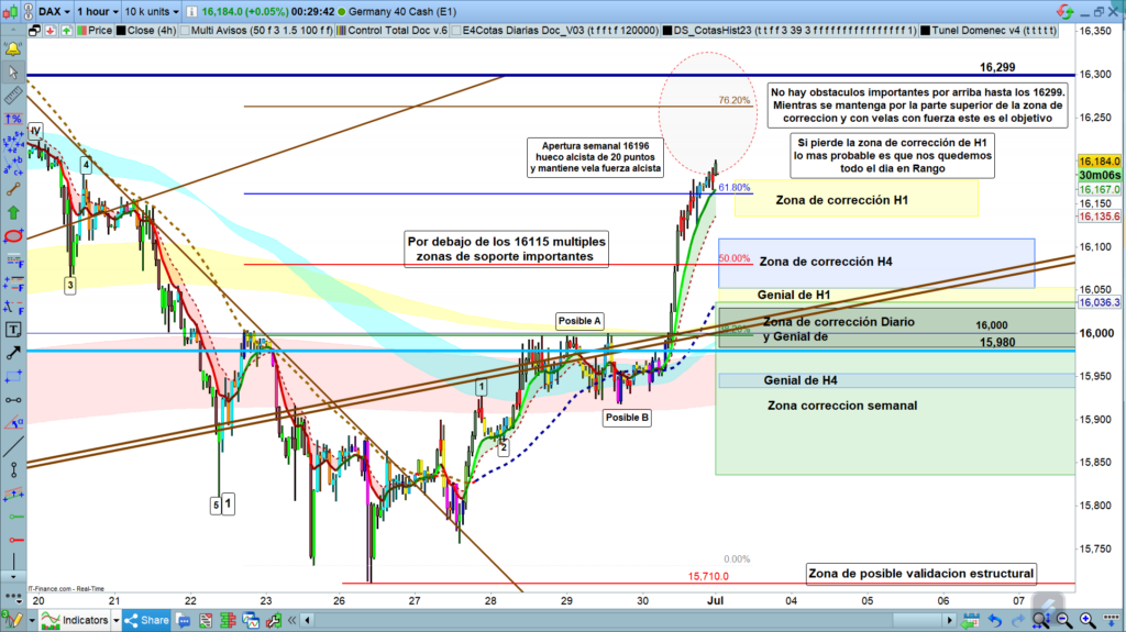 En gráfico de una hora del Dax40, después del día de cierre del pasado viernes, recordemos que tuvimos cierre semestral, trimestral, mensual y semanal todo el mismo día el viernes, la apertura Semanal ha sido con un hueco alcista de 20 puntos en la zona de los, 16196, y lo más importante manteniendo de momento la fuerza alcista del movimiento.