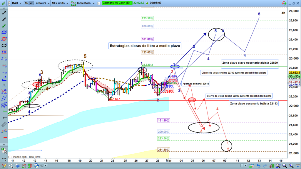 El DAX se encuentra en una zona crítica, con un rango clave definido entre 22,829 y 22,113. El análisis de ondas de Elliott y retrocesos de Fibonacci sugiere dos escenarios bien marcados: