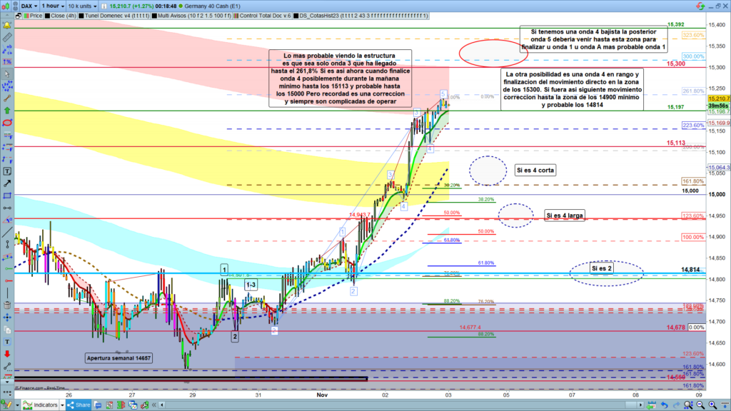 Aún queda una posible nueva opción, dentro de los movimientos de ayer, en que tuvimos varios episodios de rango lateral, que en uno de los últimos se hubiera producido esta teórica corrección de onda cuatro, y estuviéramos ya en la fase final de la actual estructura. La zona objetivo seguiría siendo la zona de los, 15300. Si esto fuera así, la corrección a partir de este punto sería mucho más importante, llegando como mínimo a la zona de los,14900 a 14814, ya que estaríamos en una corrección más importante de onda B u onda 2,