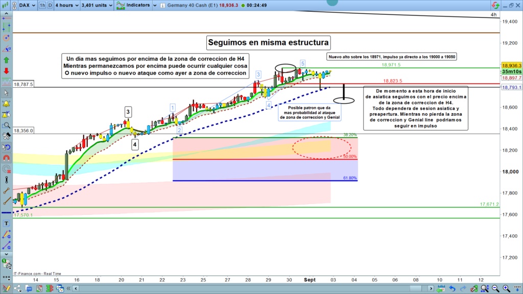 En gráfico de cuatro horas del Dax 40, seguimos exactamente en la misma situación y misma estructura, precio se sigue manteniendo de momento por encima de la zona de corrección. Quizá lo más importante es un mínimo patrón de posible doble techo que podría acabar de convencer al mercado para un movimiento bajista un poco más importante y llegar hasta la zona de los, 18670.