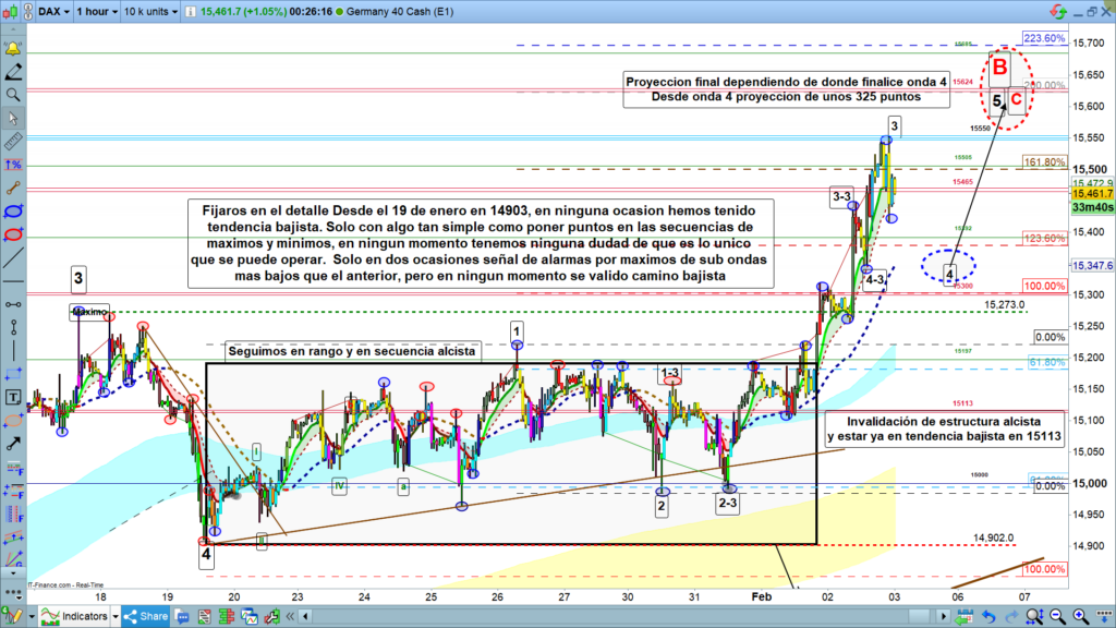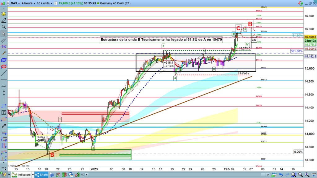 En gráfico de 4 horas del dax40, vemos la estructura de la onda B casi completada, ya teníamos onda 1, onda 2, y onda 3, el 19 de enero ya se ha confirmado que los 14902, fueron onda 4. Después de las dos semanas de rango para hacer onda 1 y onda 2, de la última onda 5 la dinamización del mercado de estos dos últimos días, nos ha llevado hasta la zona objetivo esperada. De entrada parece que el testeo de los 15550, podría ser solo onda 3 de 5, esto es lo que veremos en el día de hoy.