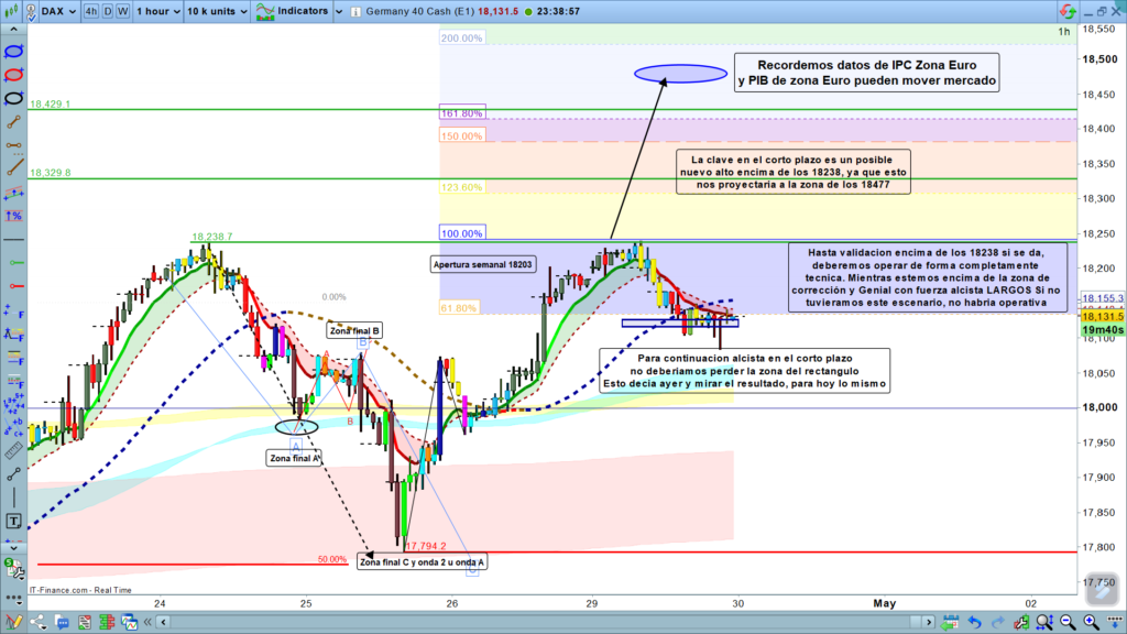 Solo con una sorpresa negativa con los datos, podríamos tener un movimiento bajista aproximadamente hasta la zona de los, 18000, pero teniendo en cuenta, datos europeos no solemos tener sorpresas, lo normal es que rebotemos en la zona donde paró ayer y reemprendamos impulso alcista. Muchísima suerte y muy buenos trades.