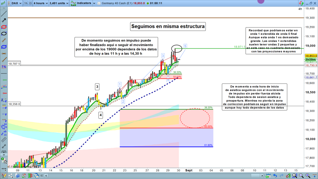Para hoy sencillamente seguimos en impulso, al menos de momento en el inicio de sesión asiática, todo o mucho dependerá de lo que ocurra en sesión asiática y preapertura, pero sí realmente, el movimiento de ayer, hubiera sido ya máximo histórico lo normal es que deberíamos haber atacado con fuerza al menos la zona de corrección de H1, mientras el precio se mantenga por encima de las zonas de corrección, claramente seguiremos en el mismo movimiento impulsivo que ayer nos subió a 18971 y hoy debería sobrepasar los 19000.