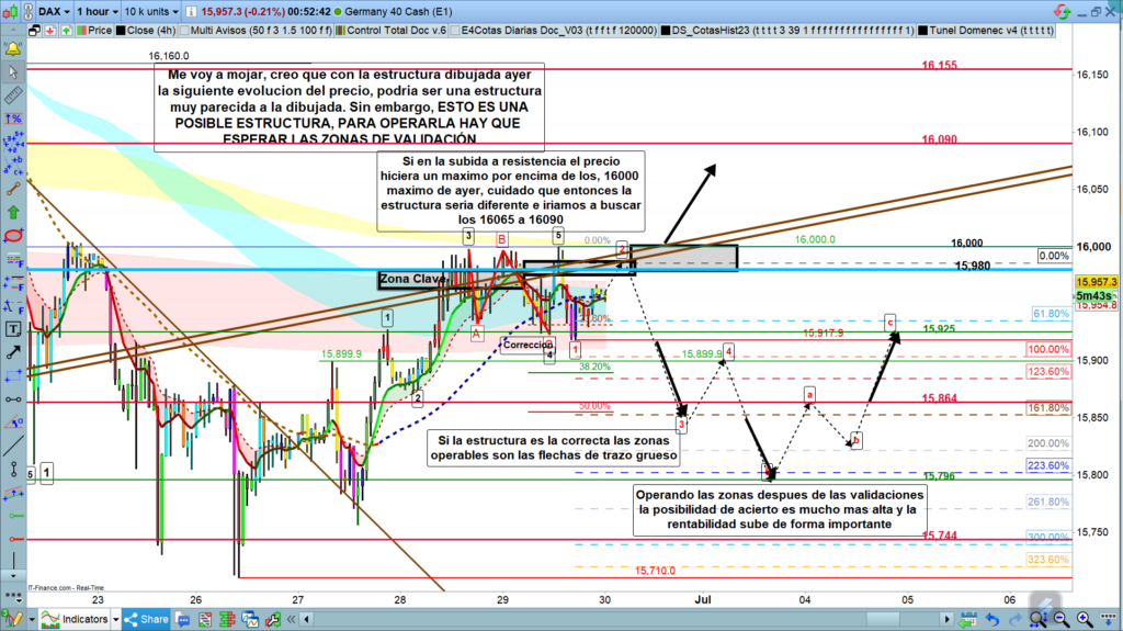 En el caso, de que el precio suba hasta la zona de resistencia de nuevo en la zona de los,15980, si tuviéramos un nuevo alto por encima de la zona de los,16000, máximo del día de ayer, esto invalidaría la estructura propuesta y al contrario lo más probable sería que el precio subiera hasta la zona de los 16065 a 16090. Y en esta zona posible rebote. Fijaros que si esto fuera así, no ocurriría absolutamente nada negativo para nuestra operativa, ya que en ningún momento hubiera validado y, por tanto, no hubiéramos entrado a mercado en sentido bajista. Pero si la estructura que dibuja es la prevista, ya tendremos todo el escenario preparado y esperando para poder operar los tramos más seguros. Así es como un trader de derivados se puede volver sólido y rentable.