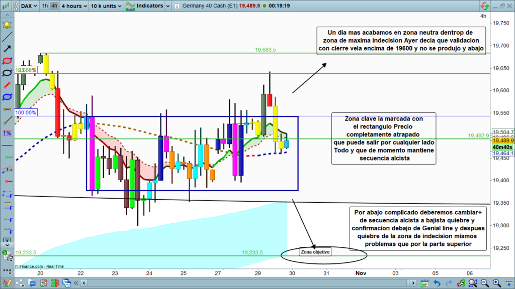 - Ayer, el precio intentó superar la zona de los 19,600, pero no logró un cierre de vela por encima de este nivel. Como resultado, el DAX continuó en una fase de indecisión, regresando dentro de la caja de indecisión y quedando atrapado entre la zona de corrección y la Genial Line. Esta falta de validación impidió que el precio iniciara un impulso alcista, manteniendo la estructura de consolidación en la zona de indecisión.
