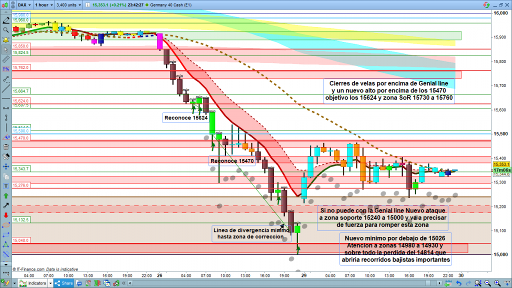 Para hoy la situación vuelve a ser de nuevo clara. Todo dependerá de la fuerza, si tenemos un poco de fuerza en el mercado, el precio podrá ir rompiendo cotas y Zonas SoR, con los patrones de reconocimiento en cada zona que ya conocéis. Rebote, Quiebre y confirmación o Consolidación. Si tenemos cierre de velas por encima de la Genial line y además un alto por encima de 15470, la zona objetivo, es primero la cota histórica 15624, y superada y confirmado él quiebre de la misma hasta la zona SoR 15730 a 15760. Por la parte inferior, tenemos la zona de fuerte soporte de gráficos grandes 15240 a 15000, que ya paro el movimiento en su primer ataque. Un segundo ataque con ciertas garantías, debería ir acompañado de mucha fuerza. En el caso que se produzca esta situación. Pueden pasar dos cosas, tener un ataque con nuevo mínimo, pero sin quiebre debajo de los 15000 en gráfico diario, o sea solo pluma sin cierre del día debajo de los 15000. La pluma podría llegar hasta la zona 14980 a 14930. O tener un cierre con velas consecutivas y progresivas de gráfico de 4 horas por debajo de los 15000, con cierre por la parte inferior de la vela diaria, lo que posiblemente nos llevaría a atacar los 14814, y objetivos mucho más bajos. Muchísima suerte y muy buenos trades.