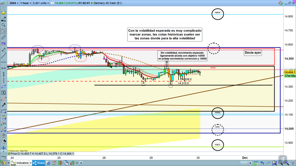 Llego el día, ya estamos en final de mes, hoy acaba el mes de noviembre que ha sido especialmente alcista, apertura mensual en la zona de los 13276, y hoy la apertura del último día en la zona de los 14400, más de mil puntos por encima. Desde el 1 de octubre en solo dos meses hemos subido desde los 11809 hasta los 14584. En el día de hoy lo más inteligente es no operar, cada uno hará lo que quiera, pero en este tipo de circunstancias, lo normal es que el mercado ya este a la expectativa de las noticias o datos macro, y los movimientos sean irregulares para no ir a ningún lado.