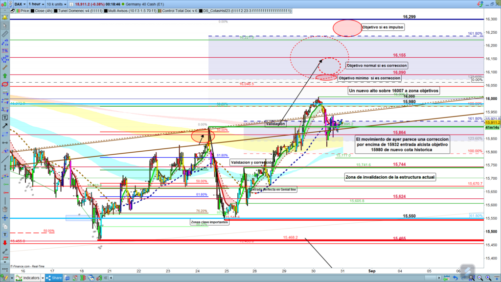 En el caso de ser un impulso, la zona objetivo esperada para final de recorrido, es la zona entre los, 16236 y los, 16299. La zona objetivo que sea donde finaliza la estructura, será la que nos marcara la posterior evolución del precio. Difícilmente, el precio puede empezar un nuevo recorrido bajista sin finalizar estructura alcista en curso. Sin embargo, cierre de velas, al menos dos consecutivas y progresivas por debajo de los 15744, deberían hacernos replantear el actual estudio, o sea marcaremos el quiebre y confirmación de quiebre de los 15744 como invalidación de la estructura actual. Muchísima suerte y muy buenos trades.