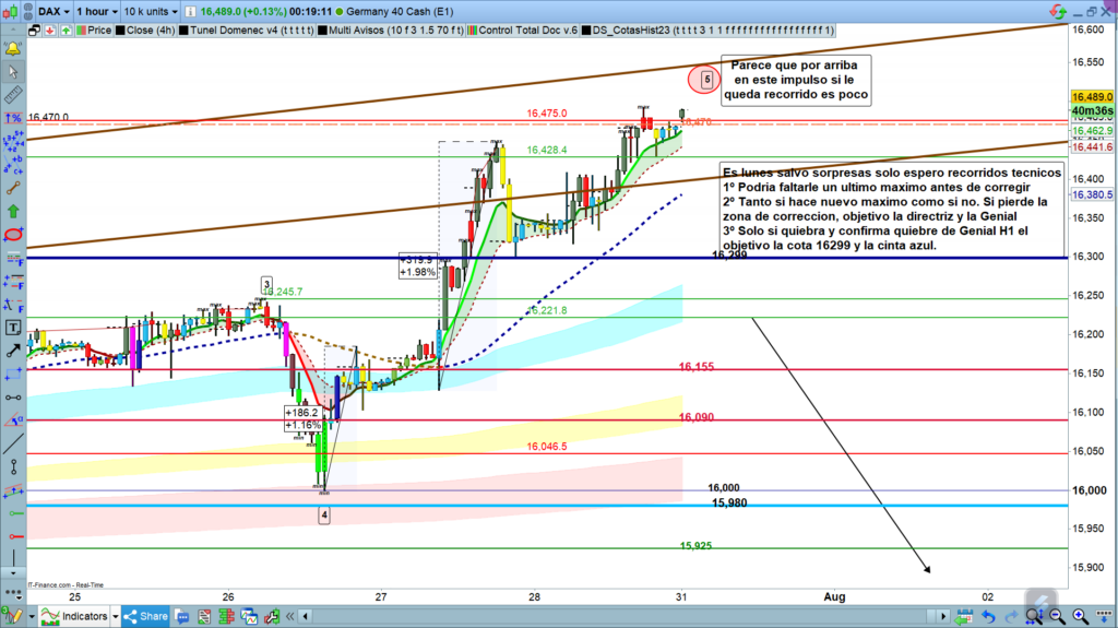 Si no es así, lo dicho tanto si acaba haciendo nuevo máximo como si no lo realiza, solo con el quiebre y confirmación de quiebre y perdida de la zona de corrección. Podríamos buscar un trade bajista, con objetivo la directriz de medio plazo, que aprox. estará en la zona de los, 16400, y que podría coincidir con la Genial line, dependiendo de la hora en que se produjera.