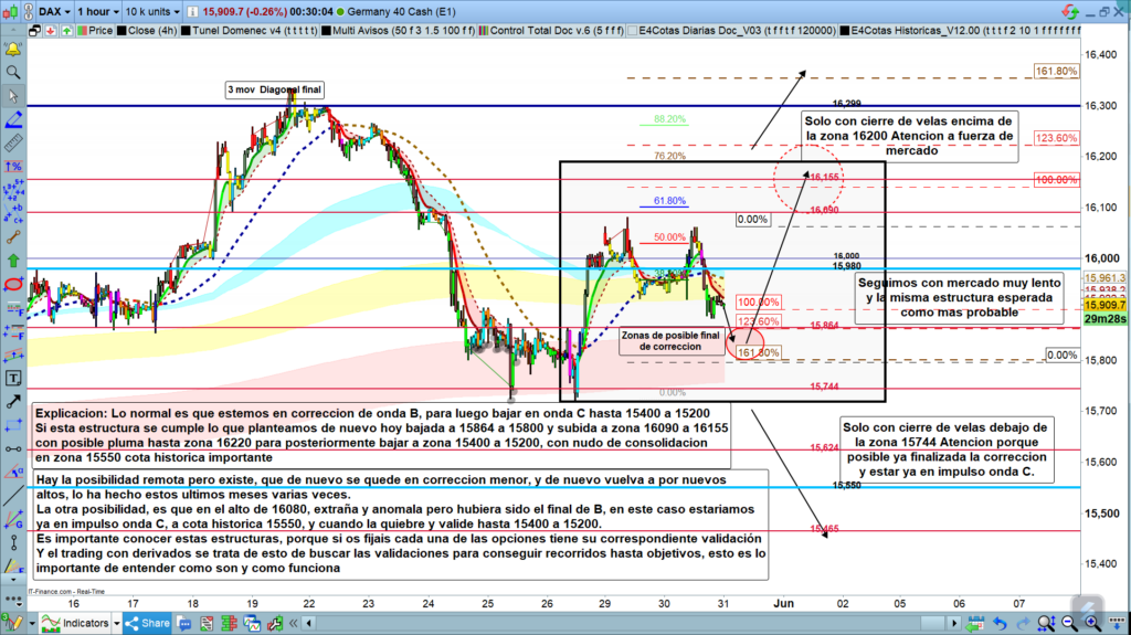 La última opción a tener en cuenta, es, precisamente, que en este caso la corrección menor sea al revés, y que el precio haya finalizado la corrección de onda B en la zona de los,16080,. Y que la actual bajada, no pare en la zona esperada de los, 15864 a 15800, sino que siga impulso bajista, porque ya estemos en el impulso de Onda C.. En este caso, el cierre de velas de gráfico de una hora, por debajo de la cota histórica de los,15744, y sobre todo con un nuevo mínimo por debajo de los, 15722, validarían esta opción de camino bajista con muchos puntos por delante. De ahí, la importancia de conocer las estructuras, así como los puntos de validación y las zonas objetivo. Si este fuera el caso tendríamos una entrada de alta probabilidad en la zona de los,15721, para independientemente de los impulsos, corrección, impulso, corrección, llegar hasta la zona objetivo en los, 15400 a 15200.