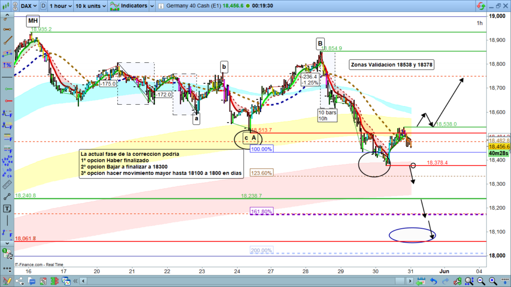 Sí, en cambio, el precio siguiera el camino bajista de estos últimos días, el movimiento más probable sería que tras validación por debajo de los, 18378, el precio llegara aproximadamente hasta la zona de los, 18300. Para finalizar el movimiento actual.
