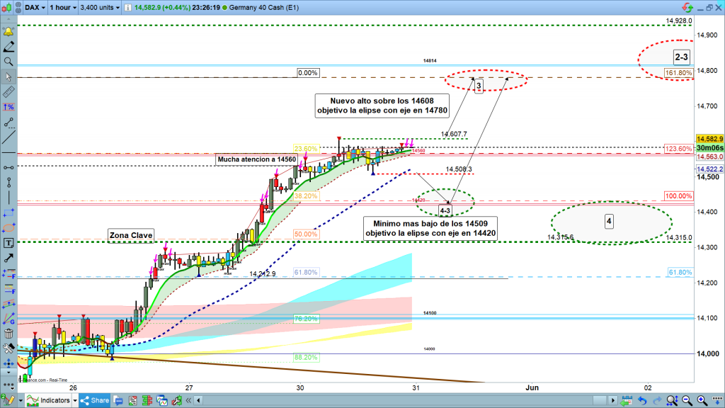 El día de ayer sin historia, en el Flash de apertura semanal, ya decía que mucha atención a la cota histórica del 14560. En la vela de preapertura europea, alcanzo la cota en cuestión, y todo el día, consolidando en ella sin recorridos significativos. Solo corrección hasta la zona de 14510, sin evolución, y vuelta de nuevo a la cota histórica. El gráfico habla por si solo.