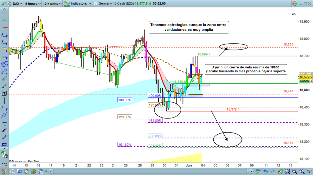 En el gráfico de cuatro horas del Dax 40, si hoy realizamos el análisis en un marco temporal ligeramente mayor, se observa que tras un día completamente neutral ayer, hoy se perfilan dos posibles estrategias claras, ambas basadas en niveles de validación.