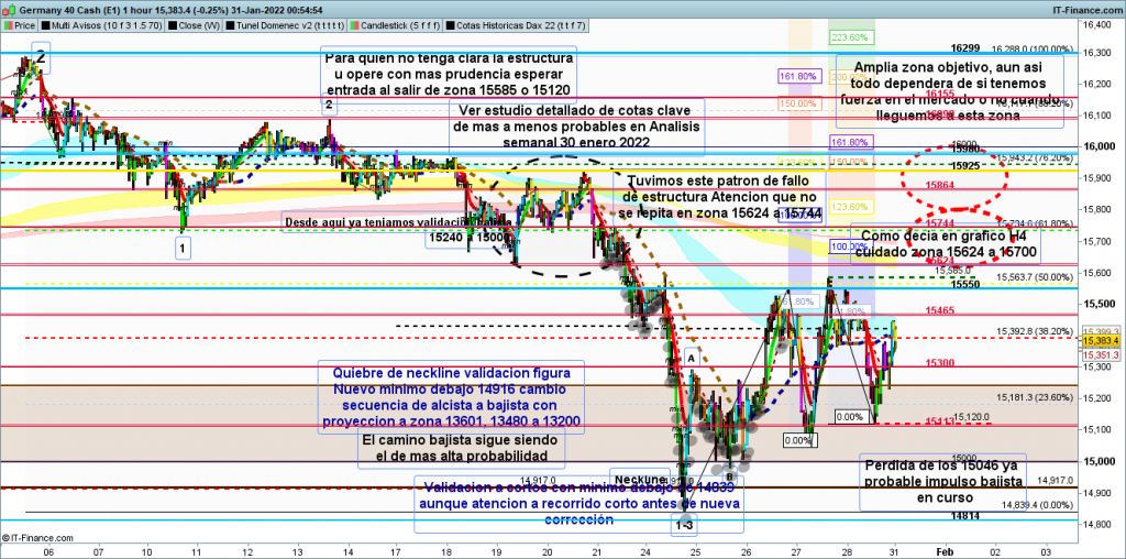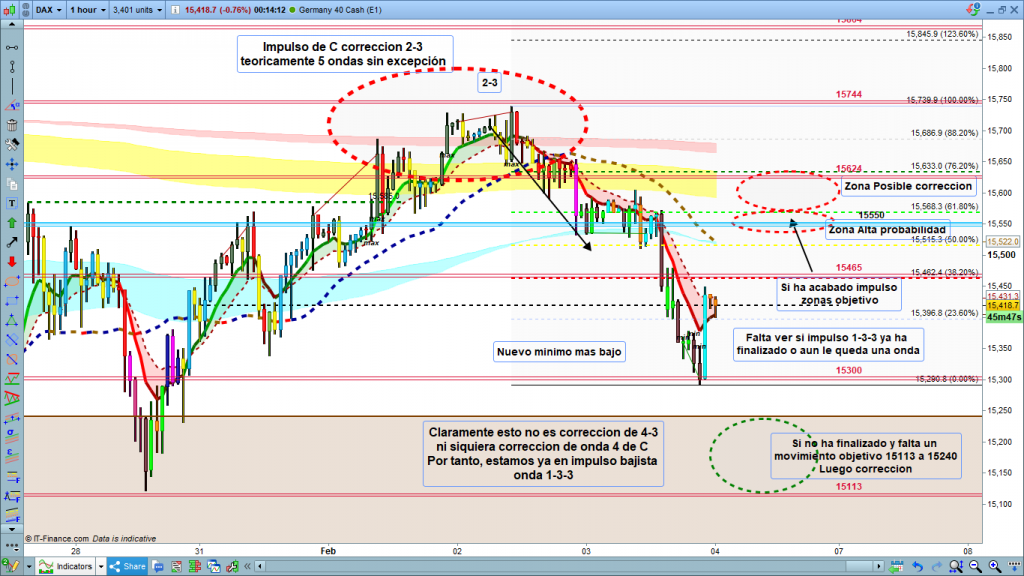 Para hoy dependerá de si el fuerte y volátil movimiento de ayer a las 22 h, acaba rompiendo o no la zona de corrección de gráfico de 1 hora. Cierres de velas por encima de 15465, darían probabilidad a estar ya en corrección hasta zona 15550, con posibilidad de llegar hasta 15624. Si en pre apertura y/o apertura, hemos perdido los 15300, es que estaremos en última onda de este impulso de primera onda bajista importante 1-3-3, objetivo la zona 15240 a 15113. Acabado este movimiento entonces si, rebote y corrección antes de seguir bajando.