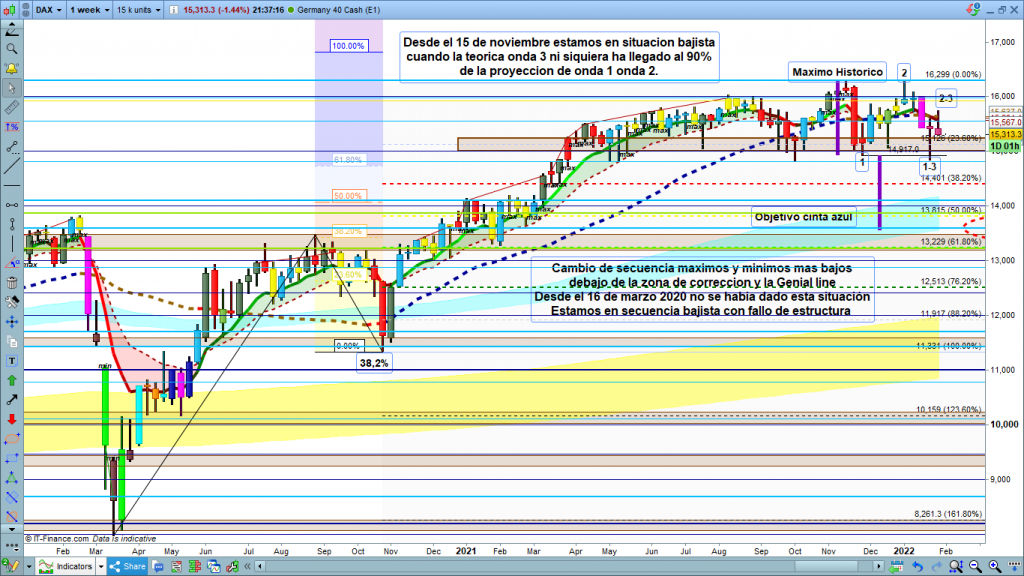 El primer gráfico de abajo es gráfico semanal, donde se puede ver toda la estructura del movimiento. Después del máximo histórico del 16299, entramos en secuencia bajista confirmada.