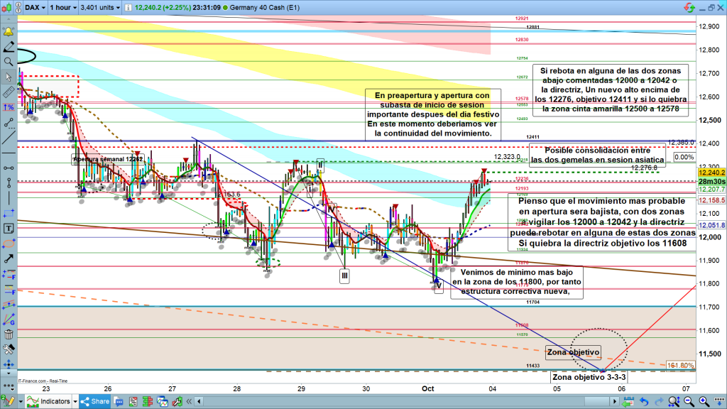 Para hoy, es muy posible que en sesión asiática sigamos consolidando entre las dos gemelas 12193 a 12236. El momento importante del día, será en preapertura y sobre todo apertura de Frankfurt. Pienso, que lo más probable es que desde la zona alcanzada tengamos movimiento bajista. Hay dos zonas que tenemos que vigilar si ocurre lo que estoy explicando. la zona de los 12042 a los 12000, y si pierde esta zona la zona de la directriz.