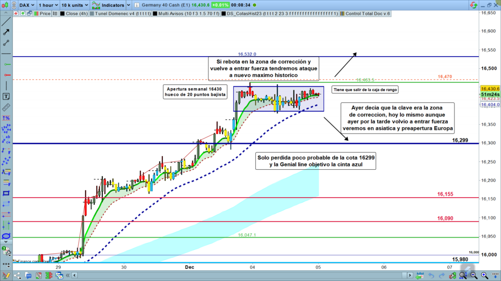 Si el precio sale por la parte superior del rango, o sea por encima de la zona de los, 16450, o más concretamente, un nuevo alto por encima de los, 16463, igual que ya explicábamos en el día de ayer, iría muy probablemente a buscar nuevo máximo histórico, de los, 16532.