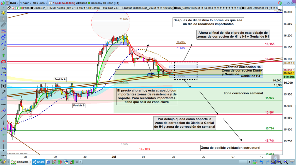 Ayer, el precio realizó el movimiento esperado y que ya habíamos marcado en el flash de anoche. Acabó perdiendo la cota histórica de los,16090, y bajó, primero, hasta la zona superior de corrección de gráfico diario, pequeño rebote, y ya en un segundo ataque, hasta la zona marcada. Obviamente con la poca fuerza del mercado y en un día tan atípico, siendo festivo en USA, tal como esperaba ahí fue donde finalizó el día. Llegó hasta la zona de soporte dentro de la zona de corrección de diario, directriz de medio plazo desde el mes de marzo, y cinta azul de gráfico de una hora. Este soporte fue suficientemente importante para parar la evolución del precio. Después de estar testeando la zona durante varias horas, acabó rebotando para ir a buscar la zona de corrección de gráfico de una hora en la zona de los, 16045 a 16050. Esta fue toda la historia del día de ayer.