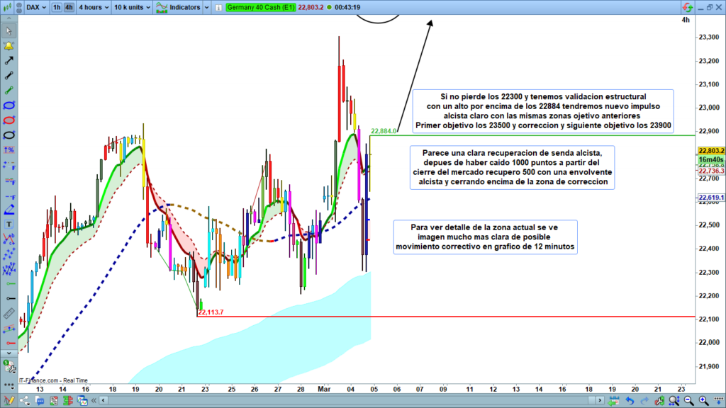 El DAX muestra una fuerte recuperación alcista tras una caída significativa de 1.000 puntos, logrando recuperar 500 puntos con un cierre por encima de la zona de corrección. Este comportamiento sugiere una posible reactivación de la tendencia alcista, siempre y cuando el precio mantenga niveles clave.