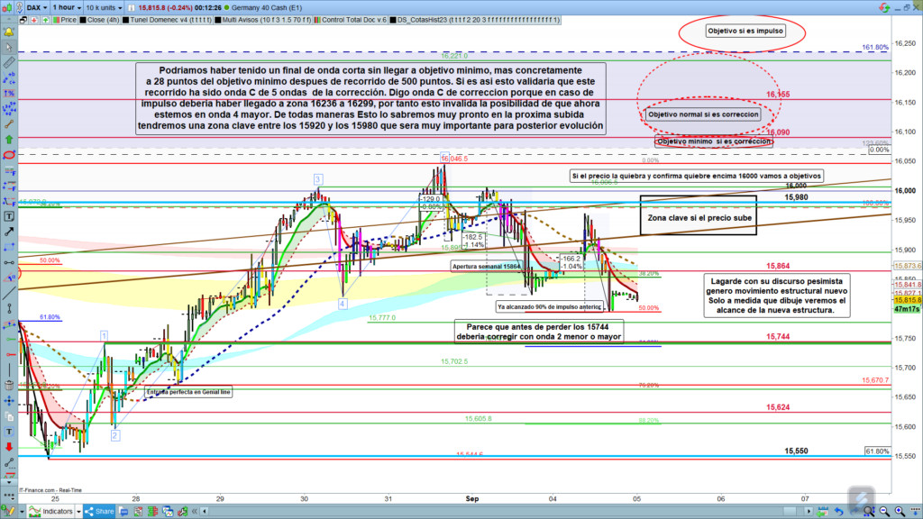 Precisamente, la actual estructura, es ambigua, necesitaremos como mínimo que haga una corrección alcista, para poder determinar mejor la estructura en la que estamos, aunque solo acabe siendo una corrección menor. Si el movimiento alcista fuera importante, atención a la zona entre los, 15920, y los, 15980, ya que está seria la zona clave para la posterior evolución del precio.